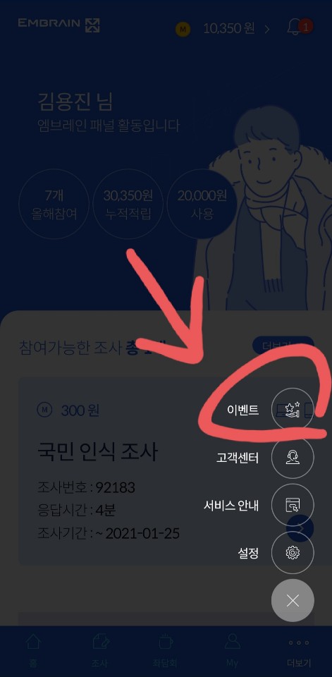 우측 하단에 더보기를 누르시면 이벤트를 확인할 수 있습니다. 매달매달 초대 이벤트와 가입 이벤트가 있습니다. 초대한 분은 1000원, 추천인을 등록하신 분은 2500원의 조사를 진행할 수 있습니다.