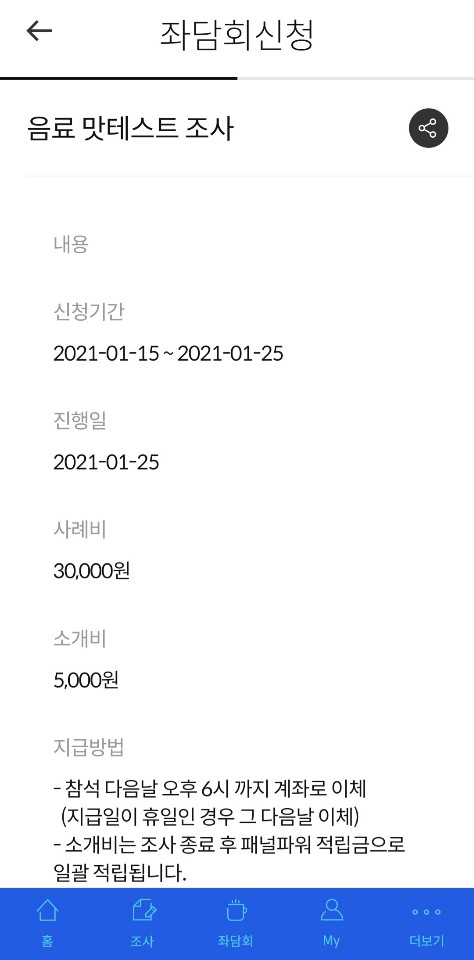 홈에서 좌담회를 누르면 좌담회에 참여할 수 있는 목록이 나옵니다. 사례비는 참여를 하는 사람이 받을 수 있는 적립금이고, 소개비는 친구에게 공유해서 친구가 참여를 하면 소개해준 사람이 받을 수 있는 적립금입니다. 근데 참석 장소는 보통 서울에 있는 엠브레인 본사입니다. 가까우신 분들은 참여를 하셔서 많은 적립금을 받는 것도 좋은 방법입니다. (저는 멀어서 PASS~)