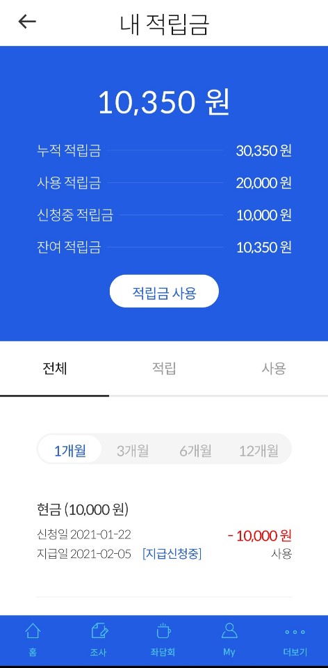 홈 화면에서 포인트를 누르거나 마이페이지를 누르면 적립금을 확인할 수 있습니다. 적립금을 받기 위해서는 적립금 사용을 눌러주세요. 최초 1회에는 개인정보와 계좌번호를 등록하고 사용을 하면 됩니다. 저는 이미 신청해서 10000원 적립 예정입니다 ㅎㅎ
