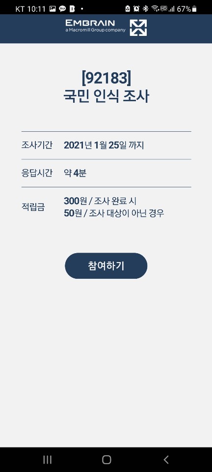 표시된 부분을 누르시면 제가 참여할 수 있는 조사들을 확인할 수 있습니다. 그중 하나를 누르면 참여하실 수가 있습니다. 그다음은 캡처를 할 수 없어서.. 꼭 한번 해보셔서 설문조사에 참여해보시길 바랍니다.