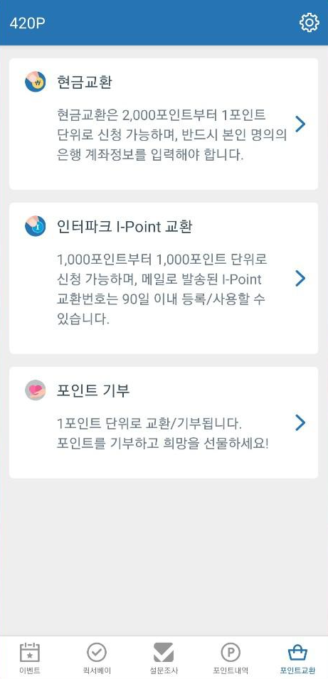 포인트 교환은 현금 교환 / I-point교환 / 포인트 기부 세 가지 방법이 있습니다.