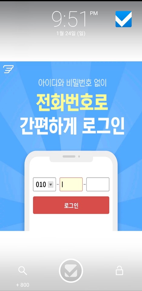 잠금화면에서 나오는 화면으로, 왼쪽으로 잠금을 풀면 미션 후 800포인트, 잠금해제를 그냥 해제하면 그냥 해제가 됩니다. 가끔 퀴즈를 푸는 패널 락이 나옵니다. 1분 안에 할 수 있는 것이므로 강추드립니다!