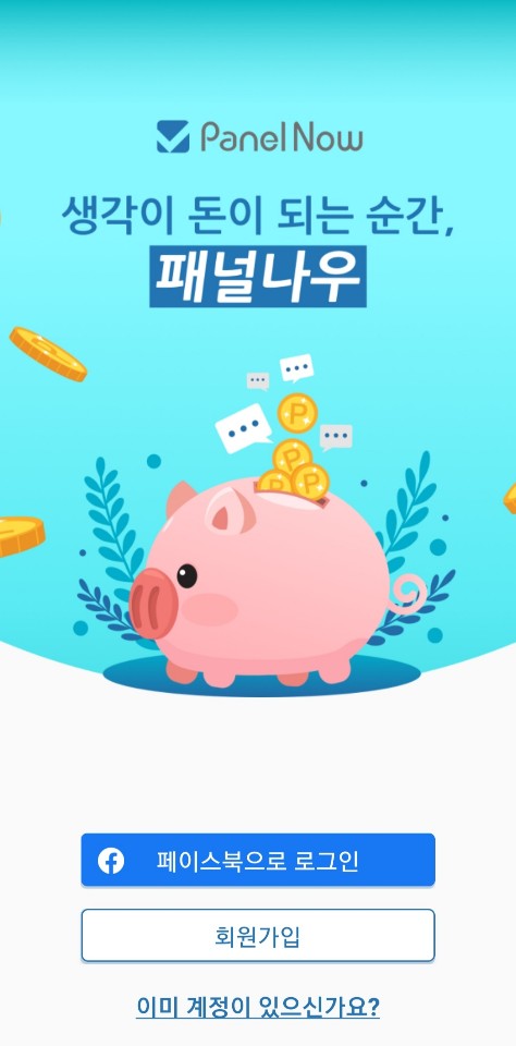 앱을 실행하면 회원가입을 할 수 있습니다. 패널나우의 편한 점은 '페이스북으로 로그인'이 존재합니다.