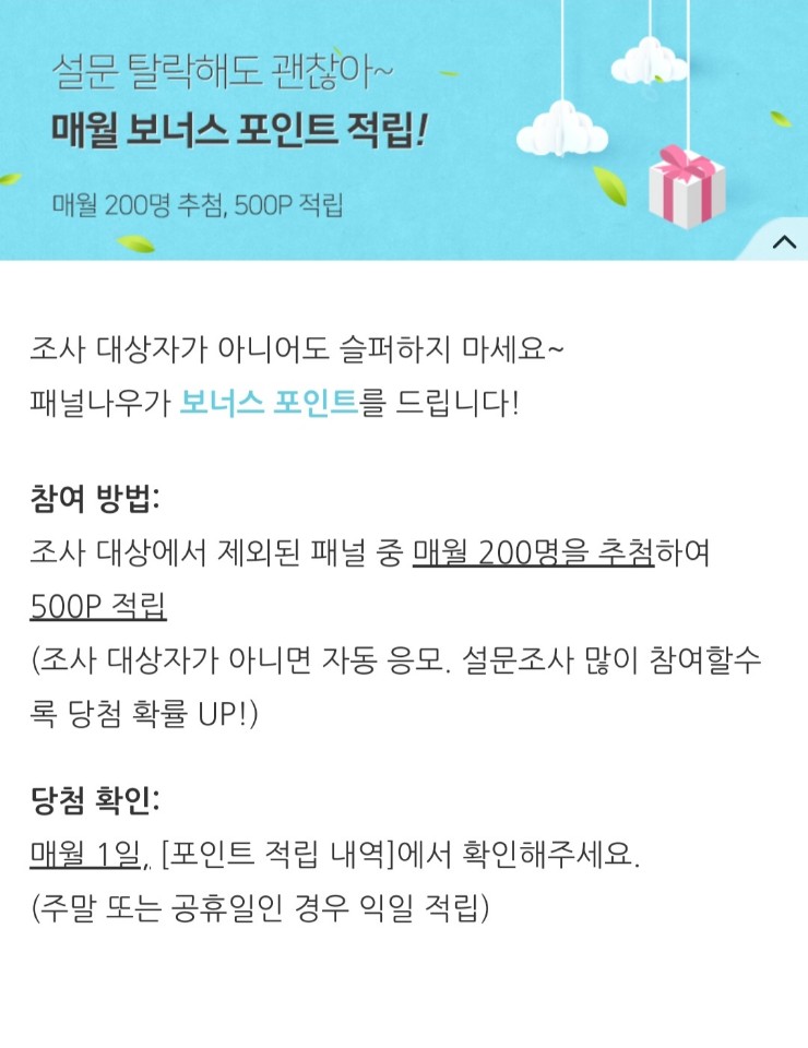 그리고 현재 좋은 이벤트를 하나 소개해드리자면, 꿀팁 2번에 퀵 서베이주제선정이 되지않아도 매월200명을 추첨해서 500P를 받을 수 있으므로 참조해주세요!