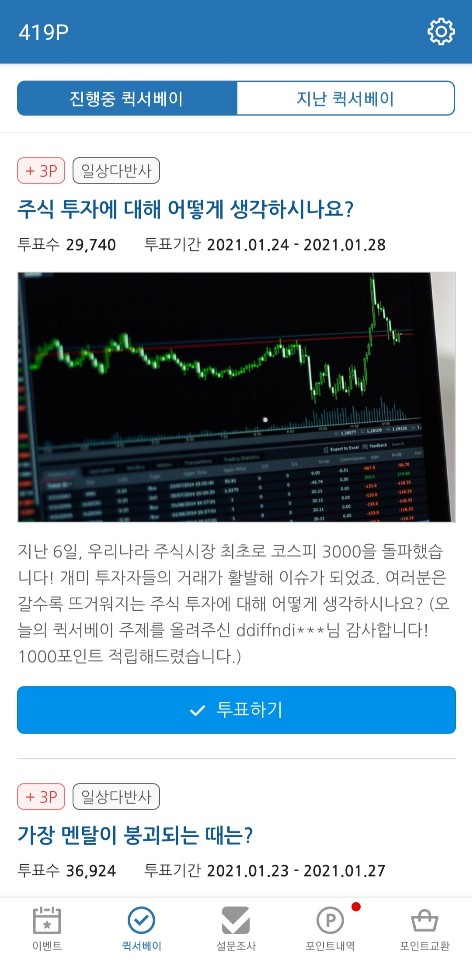 이건 PC에서만 신청이 가능합니다. 퀵 서베이 주제를 선정하셔서 선택이 되면 1000P를 받으실 수 있습니다. 자세한 건 전에 PC버전으로 쓴 저의 게시물을 참조해주세요.