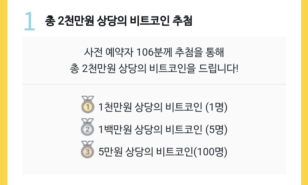 사진에서 보이는 것과 같이 사전예약의 첫 번째 혜택은 "비트코인 추첨"입니다. 천만 원어치 1명, 백만 원어치 5명, 5만 원어치 100명입니다.