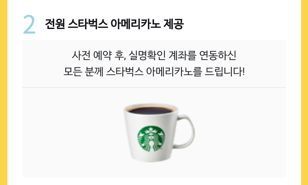 두 번째 혜택은 "스타벅스 아메리카노"입니다. 등록하게 되면 다음 오는 수요일에 스타벅스 아메리카노를 받을 수 있게 됩니다.