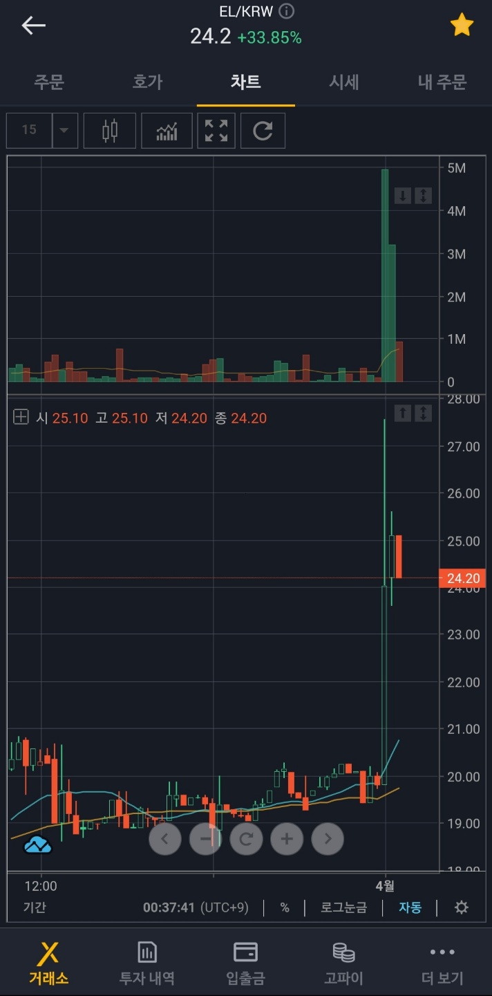 1번에서 4번까지 완료를 하면 엘리시아(EL)가 바로 입금이 되고, 비트코인 추첨 이벤트를 참여할 수 있게됩니다. 또한, 4월2일 12시 기준으로 엘리시아 가격이 42.00원이므로 14,700원을 받을 수 있습니다.