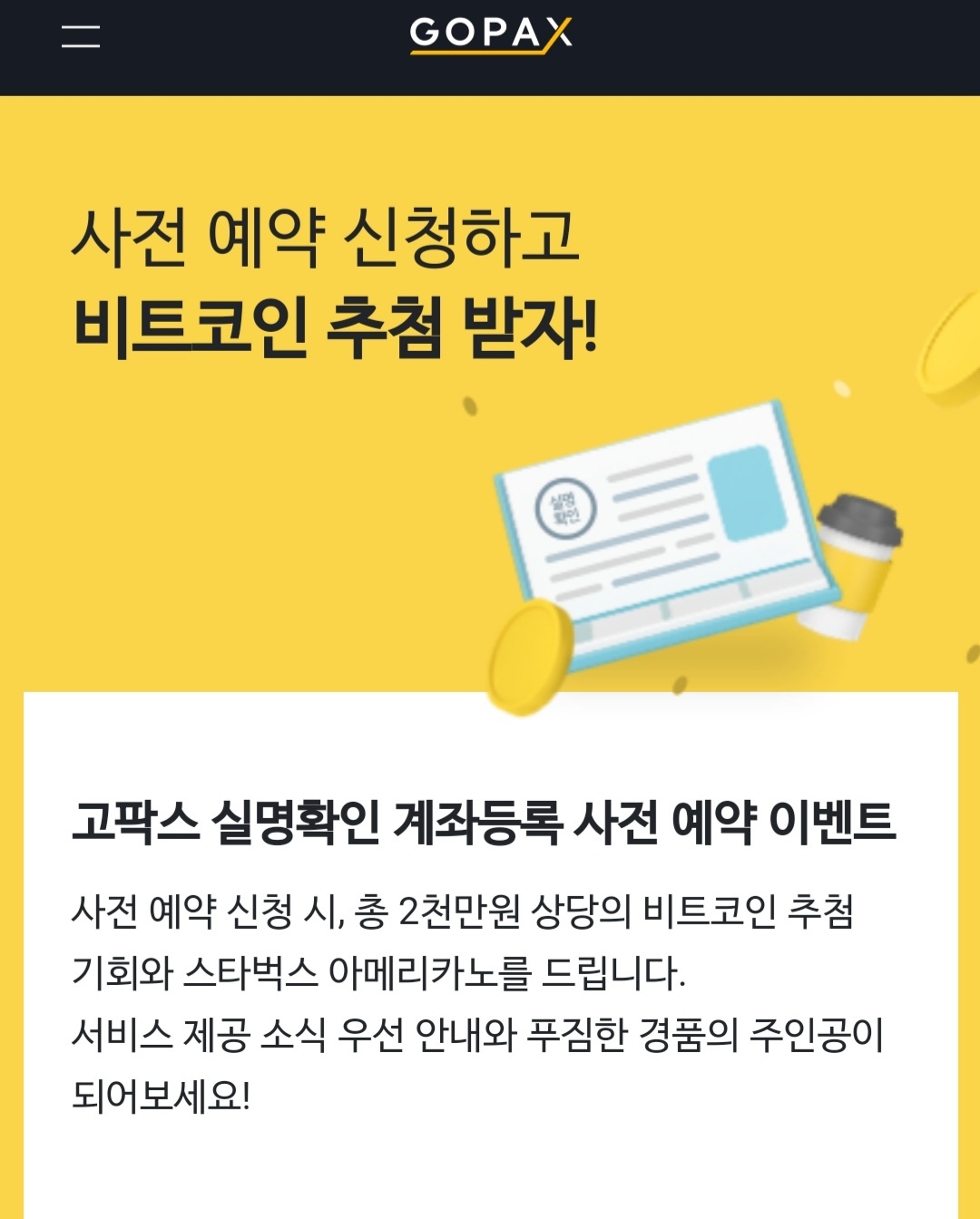 현재 고팍스에서 비트코인 추첨 이벤트를 진행 중입니다. 이벤트의 정확한 명은 "실명확인 계좌 등록 사전 예약 이벤트"입니다.