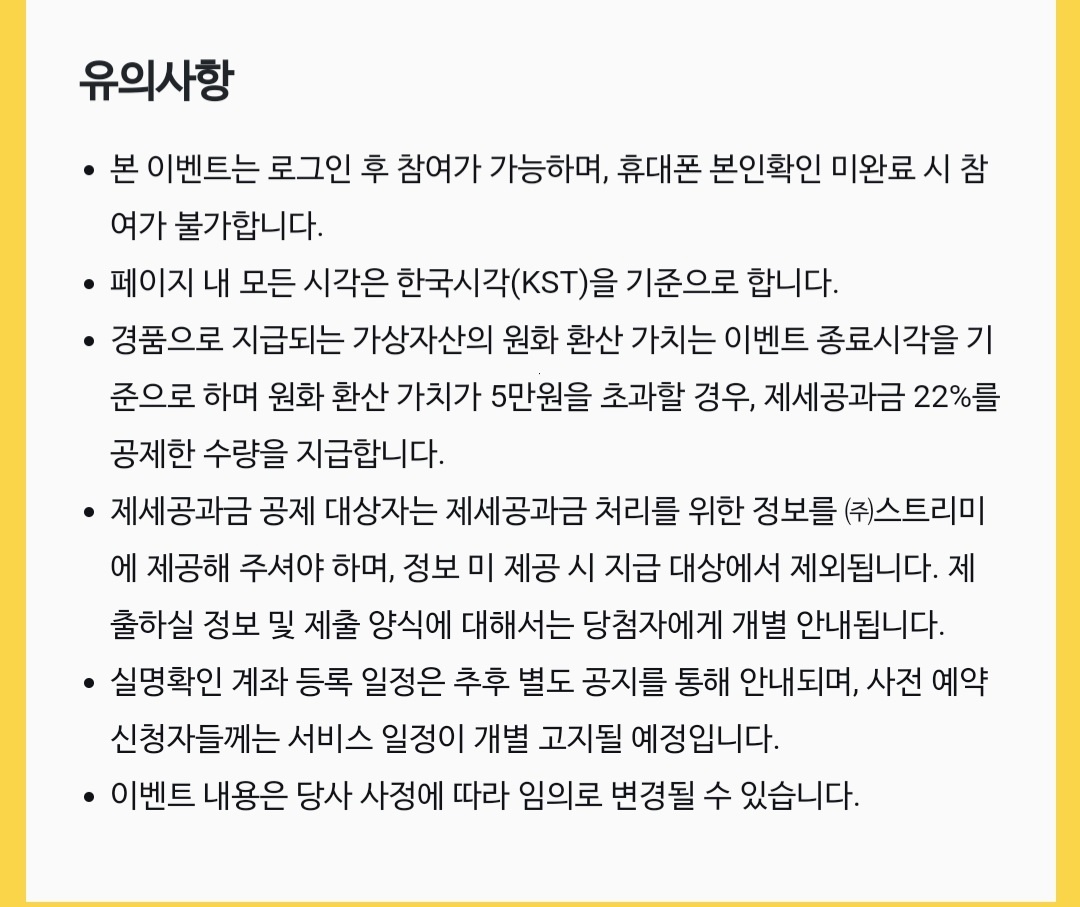 또한, 이벤트를 참여하기 위해서는 회원가입 후 휴대폰 본인 확인, 본인 계좌 확인이 필수입니다. 참고하세요!