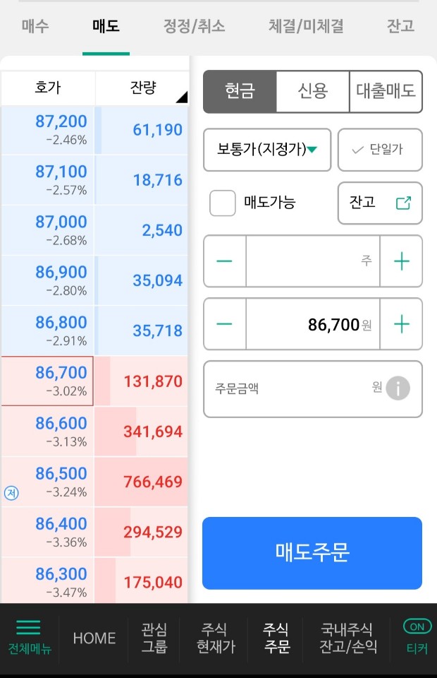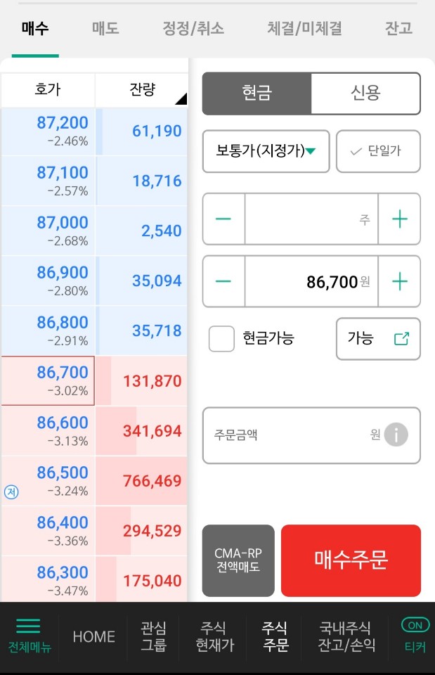 잔량 - 남은 분량 ex) 위 파란 부분의 잔량은 대기 매도잔량 / 아래 빨간 부분의 잔량은 대기매수잔량
