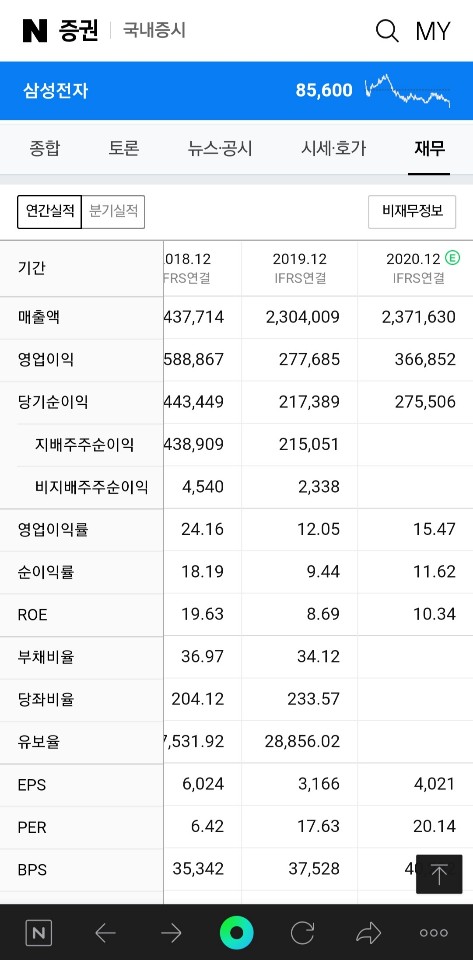 네이버 증권에서는 재무로 들어와서 연간 실적/분기 실적 선택해서 볼 수 있다.