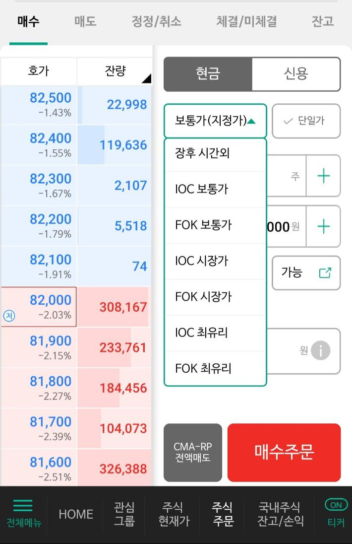 '시장가'는 줄을 무시하고 바로 살 수 있는 가장 낮은 매도호가인 82,100원으로 갑니다.'시장가'주문은 나머지 28주가 그다음 낮은 매도호가인 82,200원의 가격으로 매수를 진행합니다.