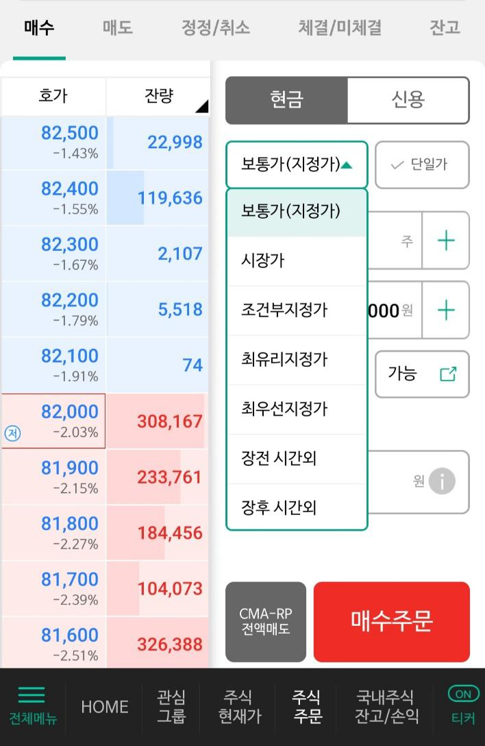 '최우선 지정가'는 매수 주문의 첫 호가(가장 높은 가격)에 주문이 들어가게 됩니다. 사진상에서는 82,000원에 주문이 들어가서 308,167의 매수주문 다음에 매수주문이 붙게 되어서 체결이 안될 수도 있겠죠?