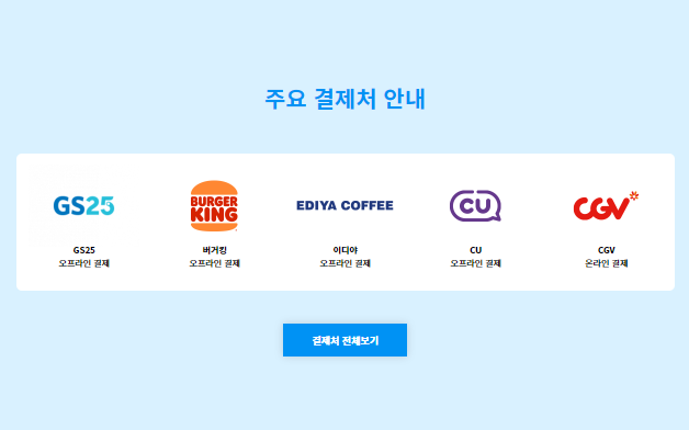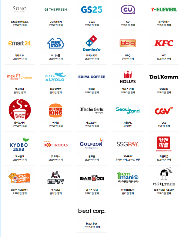 오프라인 사용처는 Gs25, 버거킹, 이디야, 씨유, CGV 등등 약 31곳에서 사용이 가능합니다.