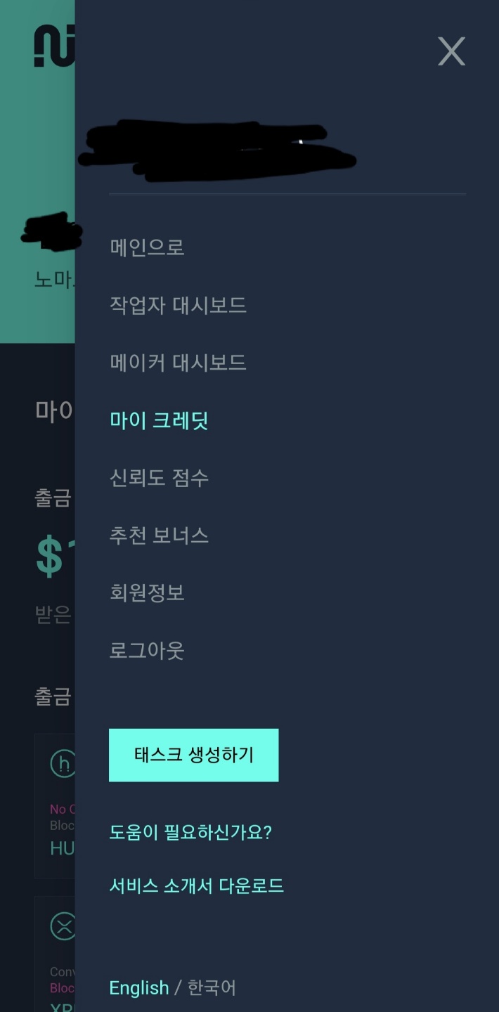 노마드태스크에서 우측 상단에 ≡를 눌러서 '마이 크레딧'를 눌러줍니다. 그럼 출금 가능 잔고와 출금 방식을 확인할 수 있습니다. 출금 방식은 HUNT토큰/ETH(이더리움)/XRP(리플)이 있습니다. 잠깐 정리를 해드리겠습니다.