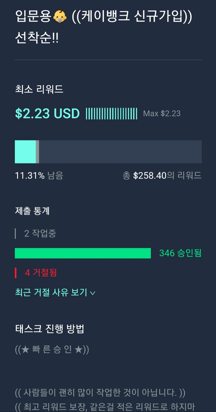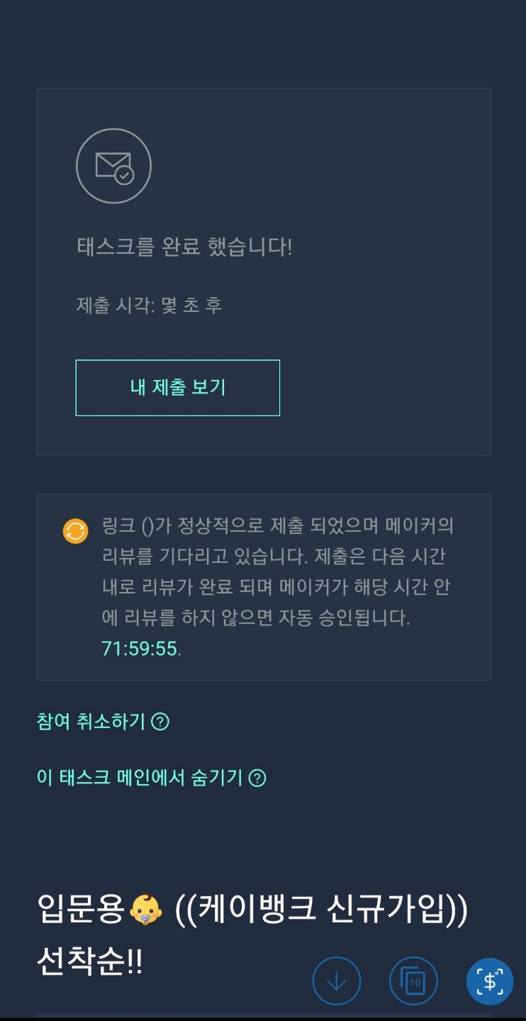 제가 먼저 미션을 완료하고 증거 제출하기를 하라는 팁을 드린 이유는 태스크 참여 제한시간이 있기 때문입니다.(물론 제한시간 내로 완료하면 상관없습니다.) 제출하고 나면, 작업 메이커가 확인을 하고 승인을 해줘야 합니다. 제 한 시간 내에 승인이 완료된다면, 몇 시간 내로 포인트가 지급됩니다. 만약, 제한시간이 지날도록 승인이 안나도 걱정할 필요가 없는 게, 제한시간이 지나면 자동으로 승인이 됩니다.