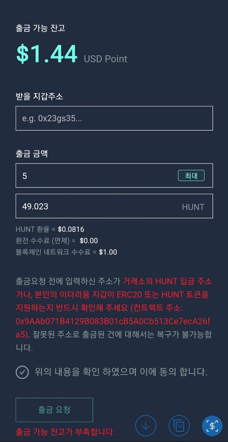 1. HUNT토큰은 전환수수료는 없고, 블록체인 네트워크 수수료가 1$입니다.