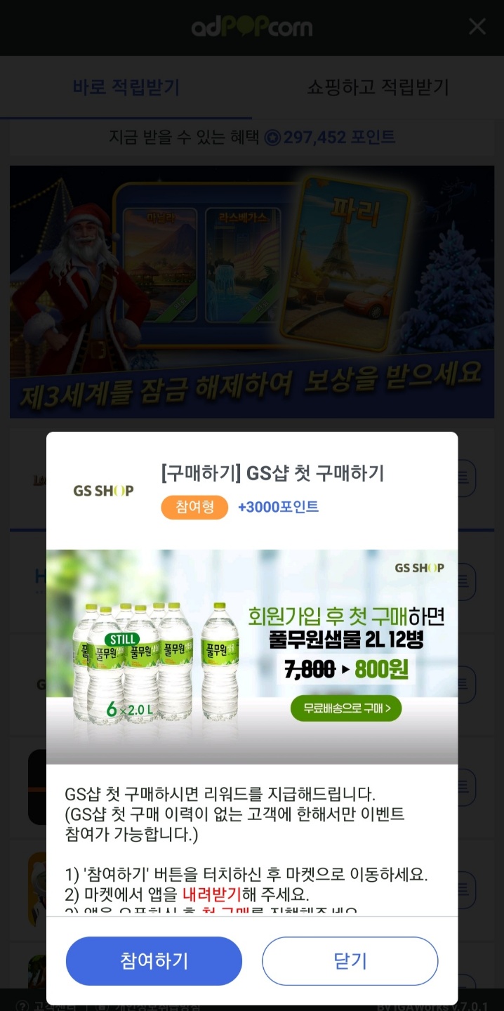 미션을 수행하기 위해서 충전소를 들어가 주세요. 충전소는 4개나 있습니다. 그중 1번 충전소로 가보고 미션을 둘러보면 참여형/설치형/참여형 이렇게 3개가 있습니다. 여기서 'gs샾 첫 구매하기' 3000포인트짜리를 눌러서 미션을 수행했습니다. 가끔 보면 저희한테 이득이 되는 이벤트도 있으니 참조해주세요!!