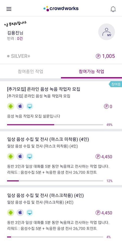 이번 앱테크 추천은 크라우드 소싱을 통한 작업을 하고 수익을 얻는 크라우드 웍스였습니다.