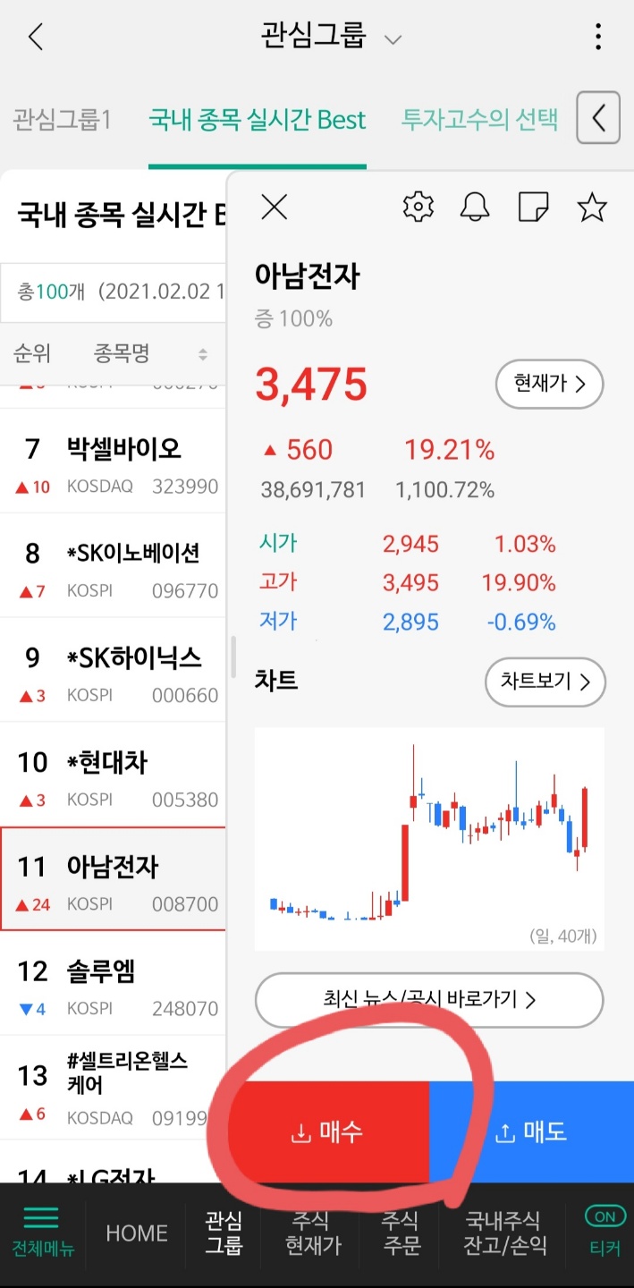 이번에는 관심그룹으로 가서 국내 종목 실시간 best로 가서 종목을 선택해보겠습니다. 잔고가 별로 안 남았으니, 싼 거로 1주만 사보겠습니다....ㅎㅎ 종목을 하나 선택해서 매수를 눌러주세요.