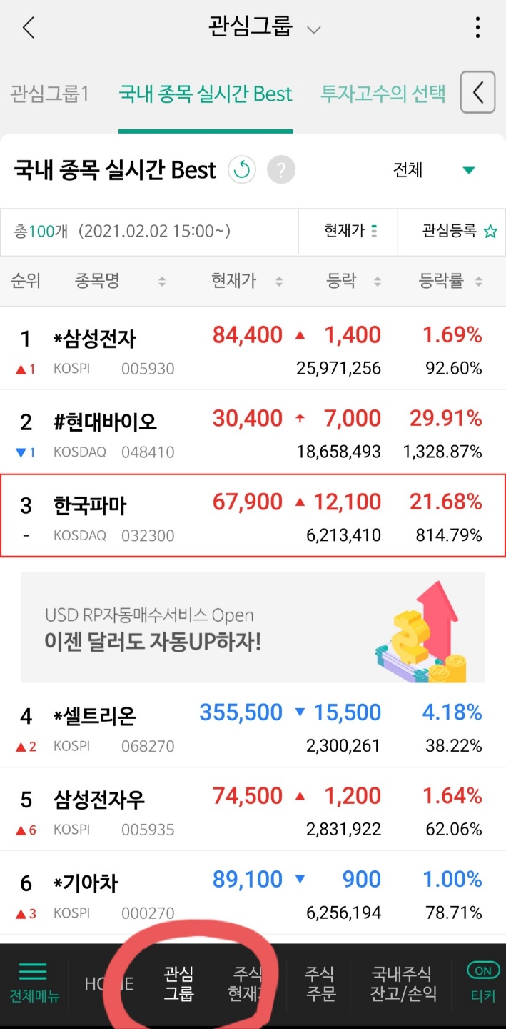 Tip. 관심그룹에서는 본인이 저장한 종목을 모아볼 수도있고, 그날의 best거래량/상승/하락 등등 선택해서 모아볼수 있습니다.
