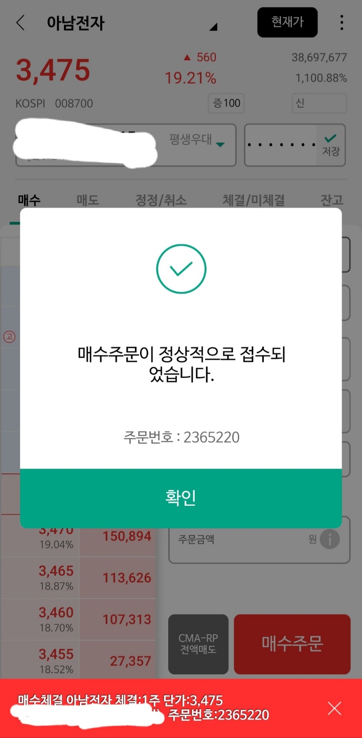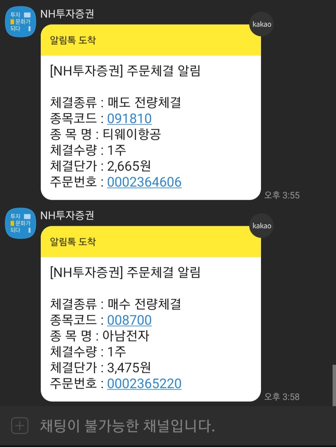 체결된 건이 카카오톡으로 알림이 날아옵니다. 또, 국내 주식 잔고/손익을 들어가 보면 제가 매수/매도한 종목의 잔고수량을 보고 확인할 수 있습니다.