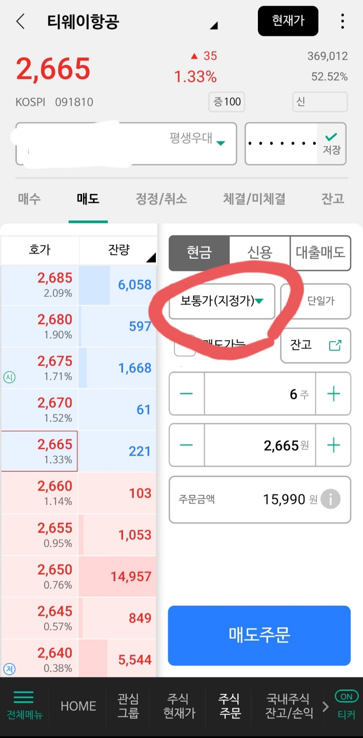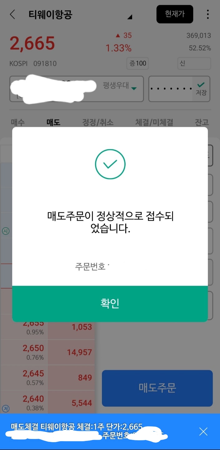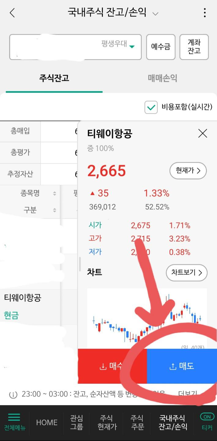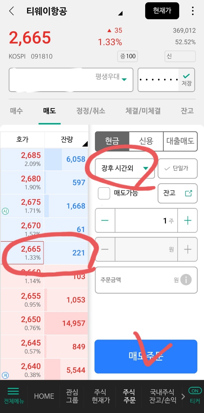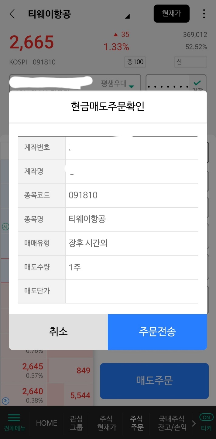 저번 매수할 때 샀던 티웨이항공을 1주 장후 시간 외종가로 매도해보려고합니다. "국내주식 잔고/손익"으로 가서 주식을 선택 후 매도를 눌러줍니다. 그와중에 이득은 좀 봤네요 ㅎㅎ