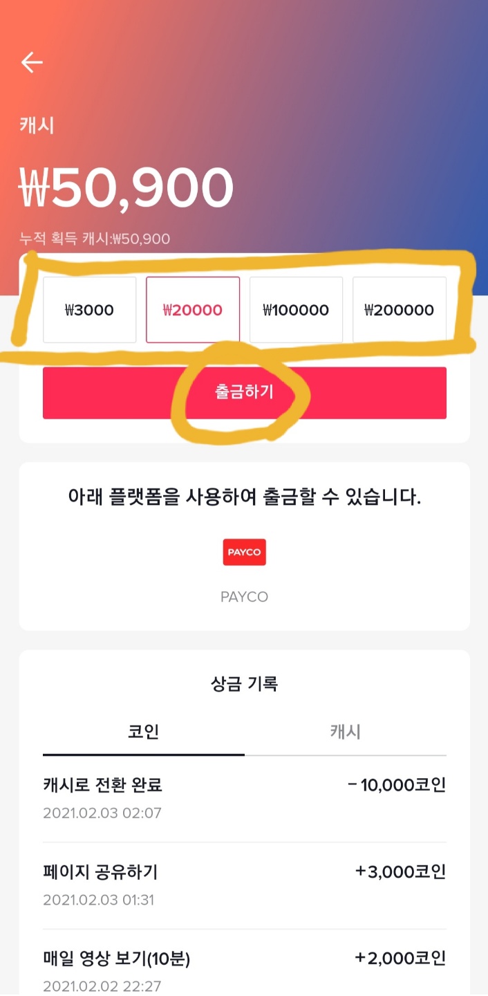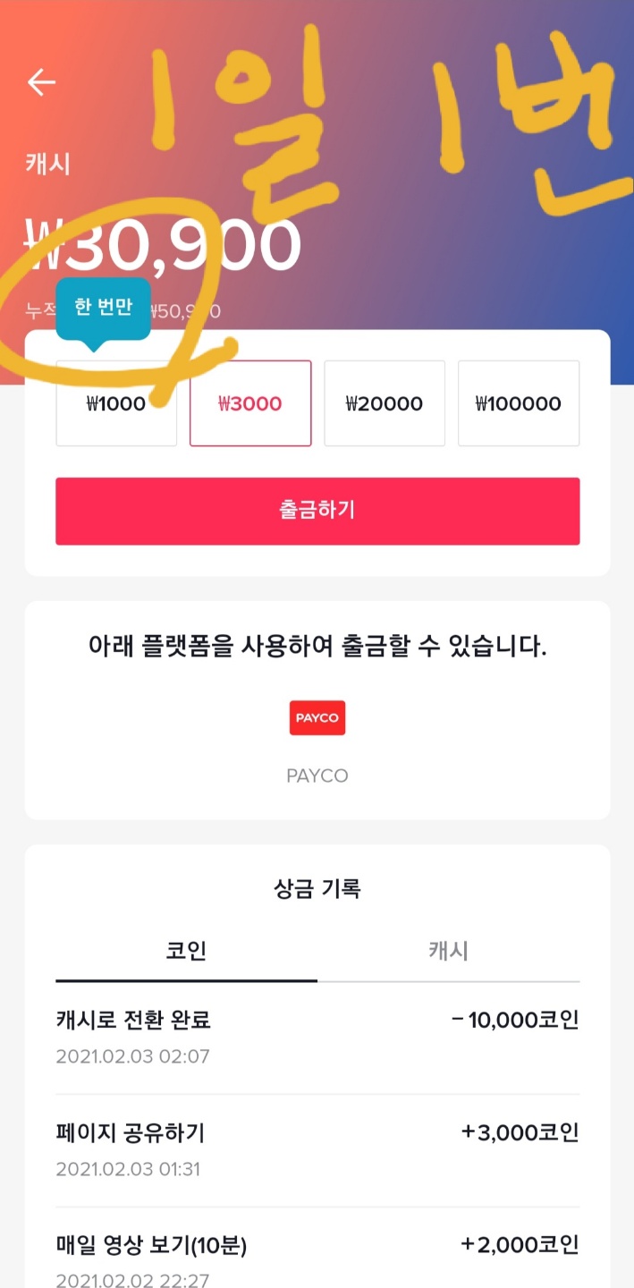 인출은 페이코로만 진행이 가능하며, 저기 보이는 정해진 금액으로 출금이 가능합니다.
