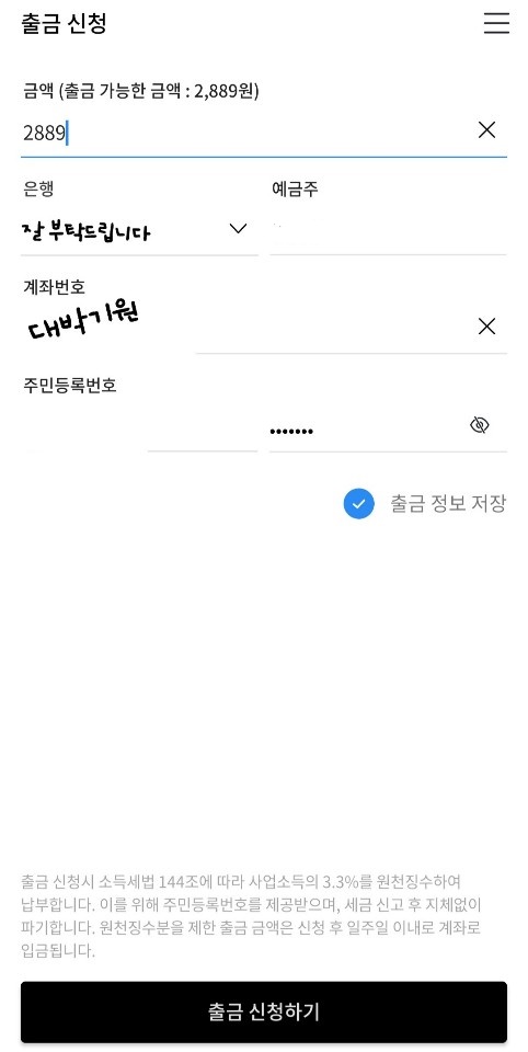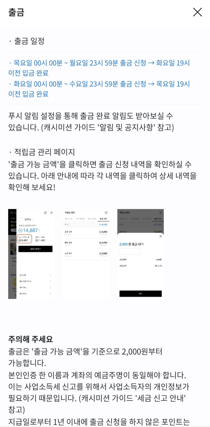 출금은 2000원부터 출금이 가능하며, 출금은 일주일에 두 번을 해주니, 열심히 모아서 바로바로 신청을 하면 자주 받을 수 있습니다. 출금 일정이 목~월 23:59까지 신청 화요일입금 / 화~수23:59까지 신청 목요일 입금 이므로 잘 계산해서 신청 시에 바로 다음날에 입금을 받을 수 있으니 잘 계산하셔서 신청하시면 됩니다 ㅎㅎ