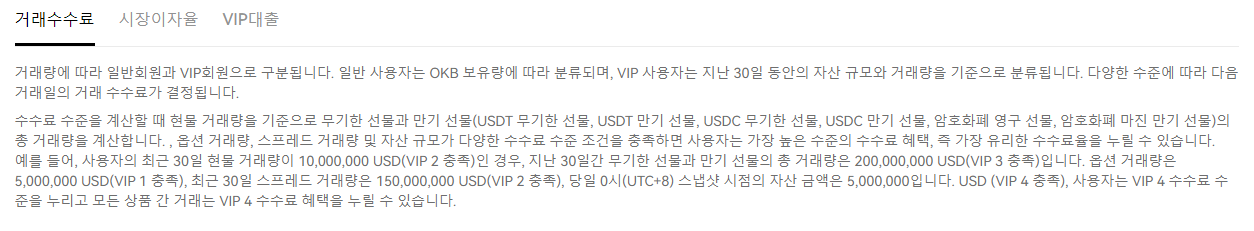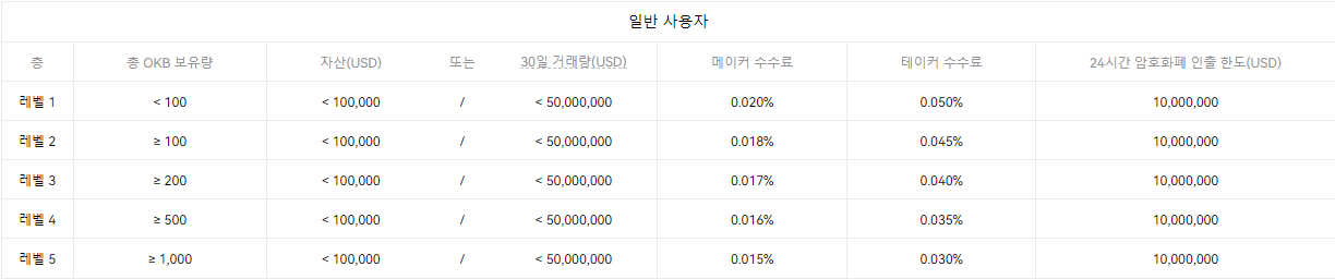 OKX거래소는 거래량에 따라서 일반회원과 VIP회원이 구분이 됩니다. 또 일반 사용자는 OKX거래소의 자체 네이티브 토큰인 OKB의 보유량에 따라 1~5단계까지 구분이 됩니다.