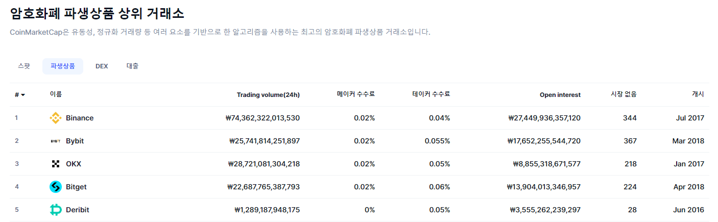 전 세계 3위의 코인거래소답게 350종 이상의 암호화폐가 등록 되어 있으며, 500종 이상의 파생상품 거래를 지원합니다.