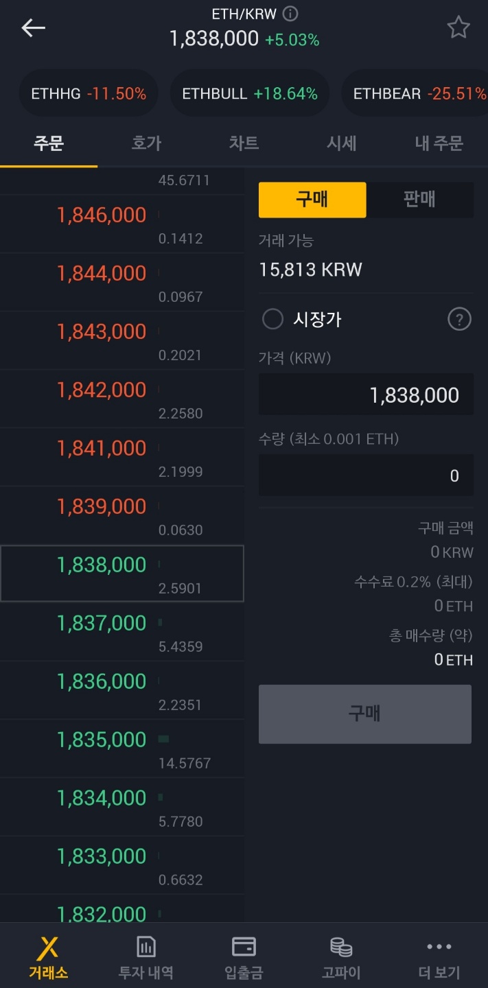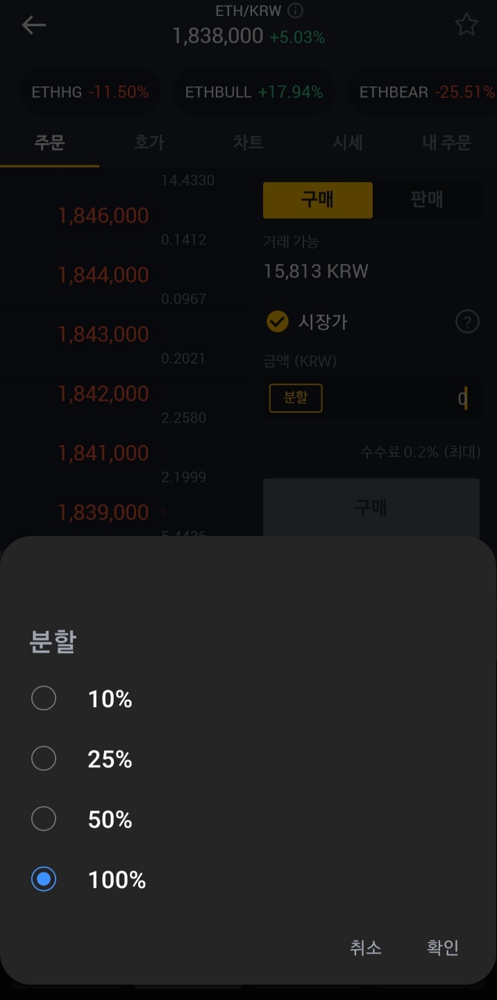 주식과 많이 비슷한 화면이 보입니다. 거래 가능한 본인 보유의 원화(15,813 KRW)가 보이고, 가격을 설정할 수 있습니다. 가격은 원화(KRW)를 기준으로 선택할 수 있습니다. 왼쪽에 호가화 거래량이 보입니다. 원하는 가격을 설정을 하시면 됩니다. 그 후에 수량을 선택하시면 됩니다. 수량은 편하게 분할을 %로 보여줍니다.