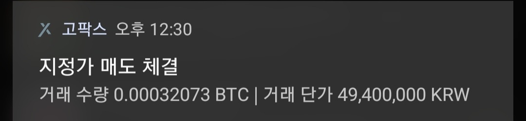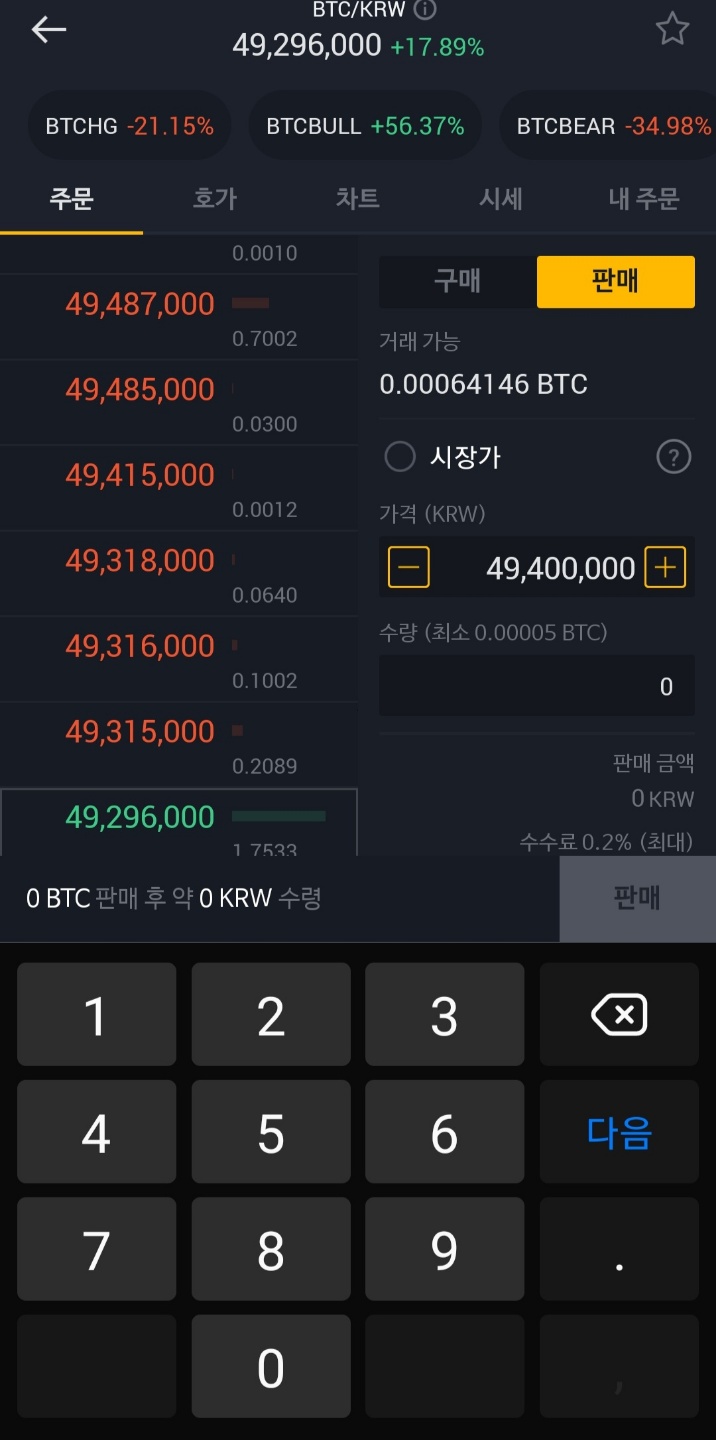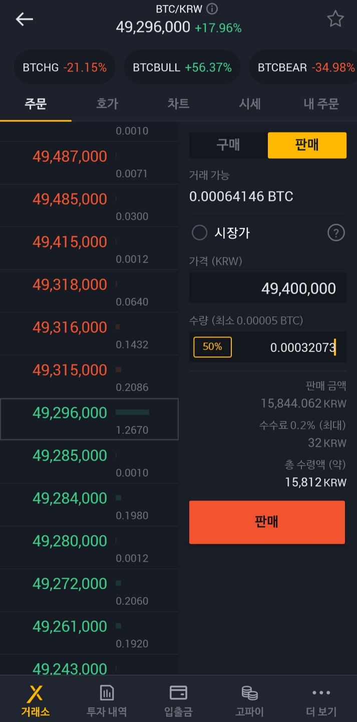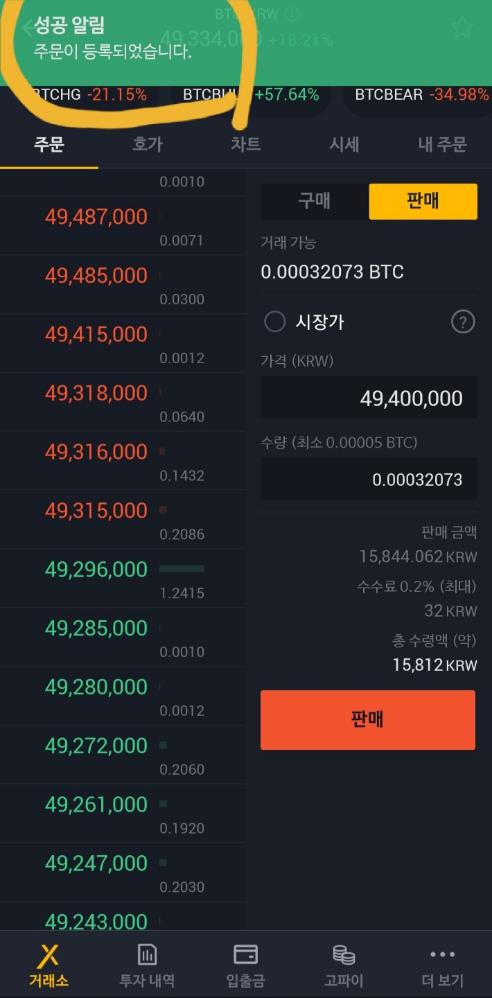 이번에는 가격이 더 오를 거 같기 때문에 현재가(49,216,000 KRW) 보다 더 높은 가격(49,400,000 KRW)을 설정하고, 나중에 더 오를 것을 생각해서 수량을 50%로 분할하여서 선택하여 달아 놨습니다.