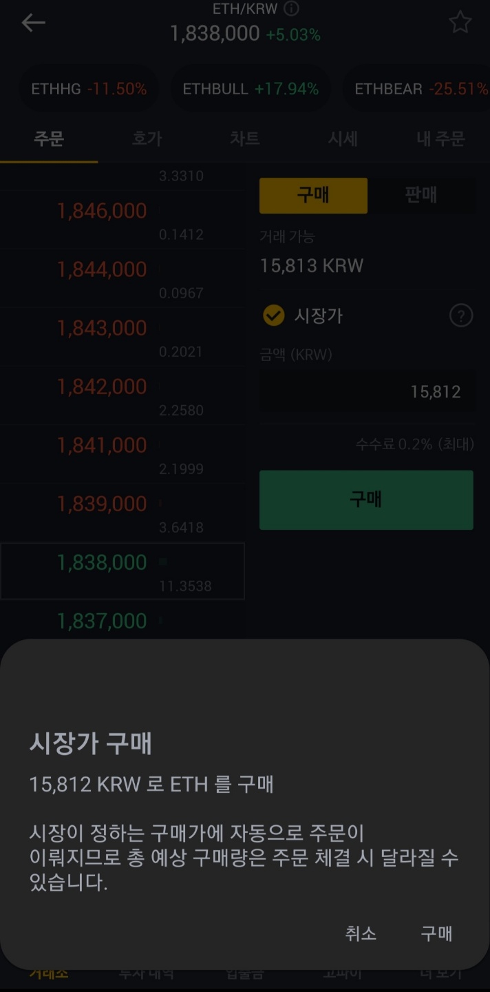 시장가로 매수를 하였기 때문에 바로 체결이 되었다는 알림이 상단에 뜬 걸 확인할 수 있습니다.