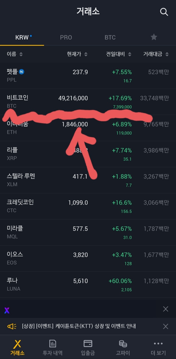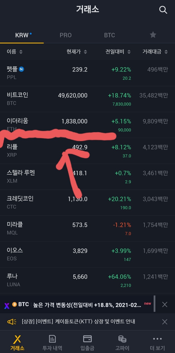 거래소에 들어가면 여러 코인들의 시세 동향을 한눈에 볼 수 있습니다.
