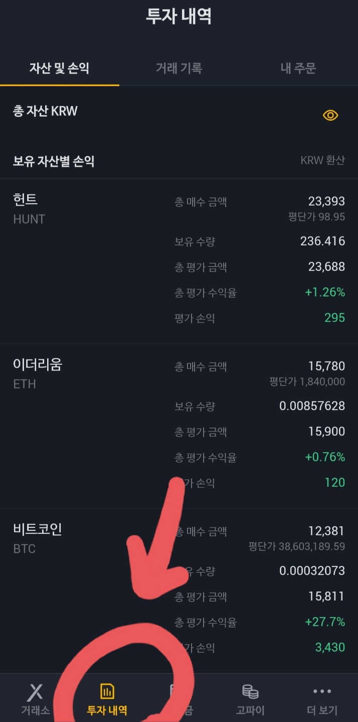 좌측 하단의 투자내역을 누르면 본인이 보유하고 있는 예수금(KRW)과 가상화폐를 확인할 수 있습니다. 가상화폐의 수익률과 평가 손익도 확인을 할 수 있습니다.