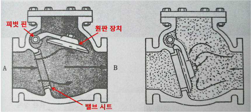 - 체크밸브 : 유체를 한 방향으로 유동, 유체의 역류를 방지하기 위해 사용하는 밸브