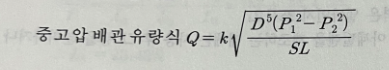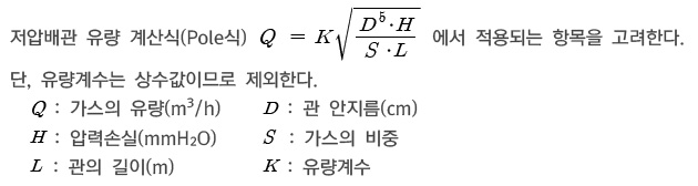 Q : 가스의 유량, D : 관의 안지름(cm), H : 압력손실(mmH2O)
