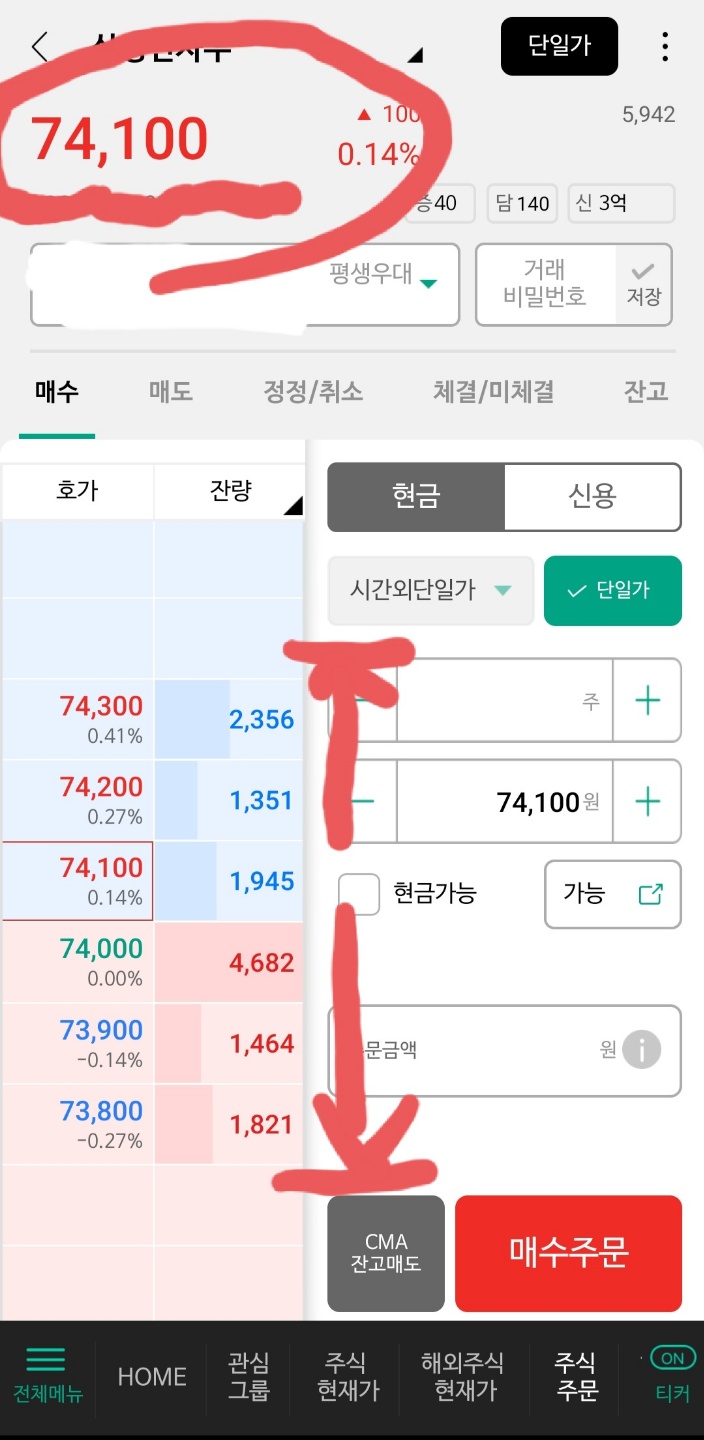 현재 보이는 호가창에서 매수 1순위는 74,000원, 매도 1순위는 74,1000원입니다. 이때, "가격 우선의 법칙"과 "수량 우선의 법칙"을 생각했을 때, 우리 같은 개미들은 "수량 우선의 법칙"은 이길 수가 없습니다. 그럼 "가격 우선의 법칙"을 노리고 들어가는 것입니다. 매수를 희망한다면, 호가창에서 보이는 매수 1순위인 74,000보다 3호가 높은 가격(74,300)으로 주문을 넣어주세요. 매도도 같은 방법으로 1순위(74,100)보다 3호가 낮은 가격(73,800)으로 주문을 넣게 된다면, 내주문이 1순위로 들어가게 됩니다.