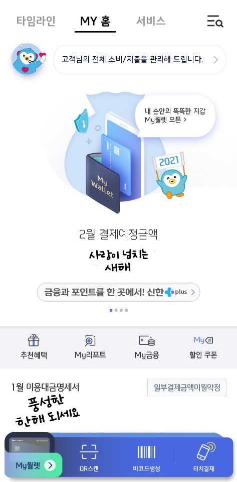 다시 신한페이판 처음 실행화면으로 가셔서 좌측 상단 타임라인을 눌러보세요.
