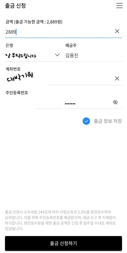 원하는 출금 금액을 적고, 은행명, 계좌번호, 주민등록번호(사업소득 세용)를 적어줍니다.